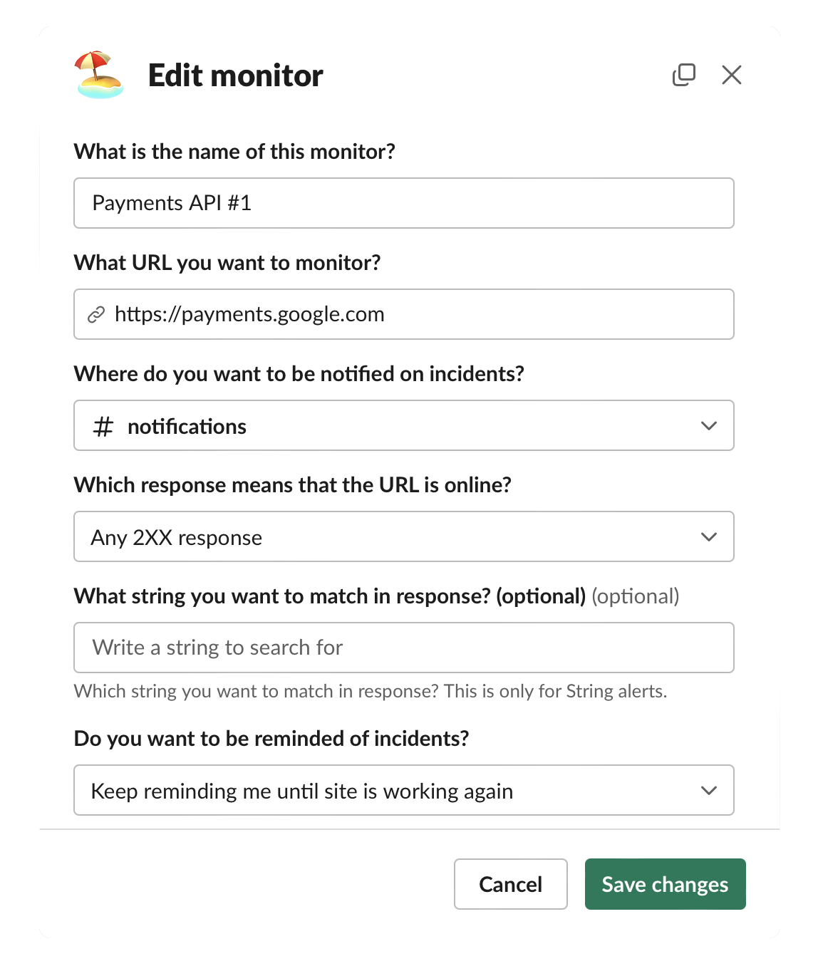 - Simple Uptime allows you to monitor any URL for downtime and uptime. We will check that your servers and websites work as intended around the clock, and send a notification for your team’s Slack channel in case something goes wrong. Simple Uptime is the easiest way to do uptime monitoring inside Slack. By default you will get notifications continuously until issue is solved, but you can also configure the notification interval.