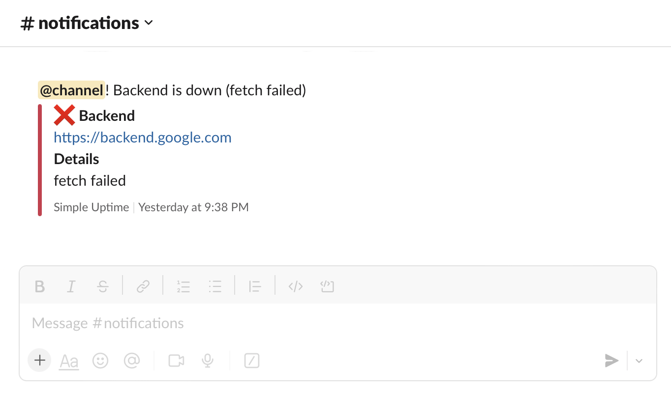 - Our Slack Bot is built for Slack. This makes it extremely fast and easy to setup. Your whole team has access to Simple Uptime without needing to register for new accounts, to login to external websites, or accept any invites. Everyone can add, edit and remove uptime monitors easily inside Slack. As we notify your team in Slack, everyone has already a mobile application installed to receive the downtime alerts on the go. No need to install any 3rd party monitor apps or share private phone numbers.