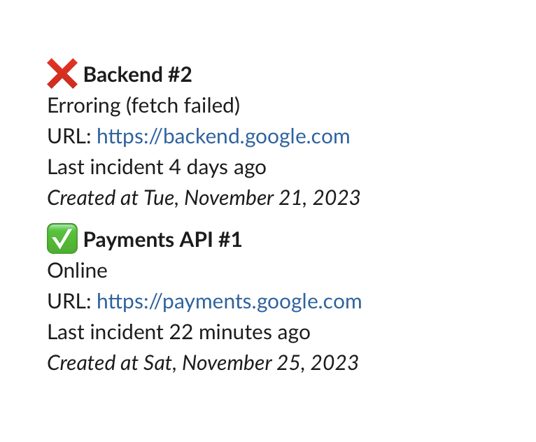 Monitor the health of websites, APIs and servers without leaving Slack. Get up/downtime alerts delivered to your team's channel. No registration needed. Setup for free in <1 minute.